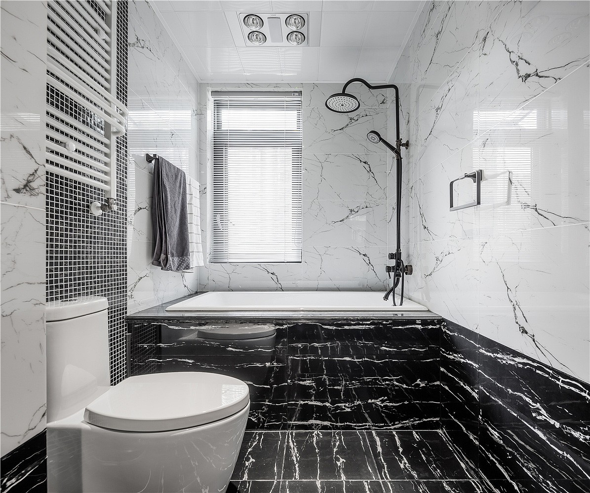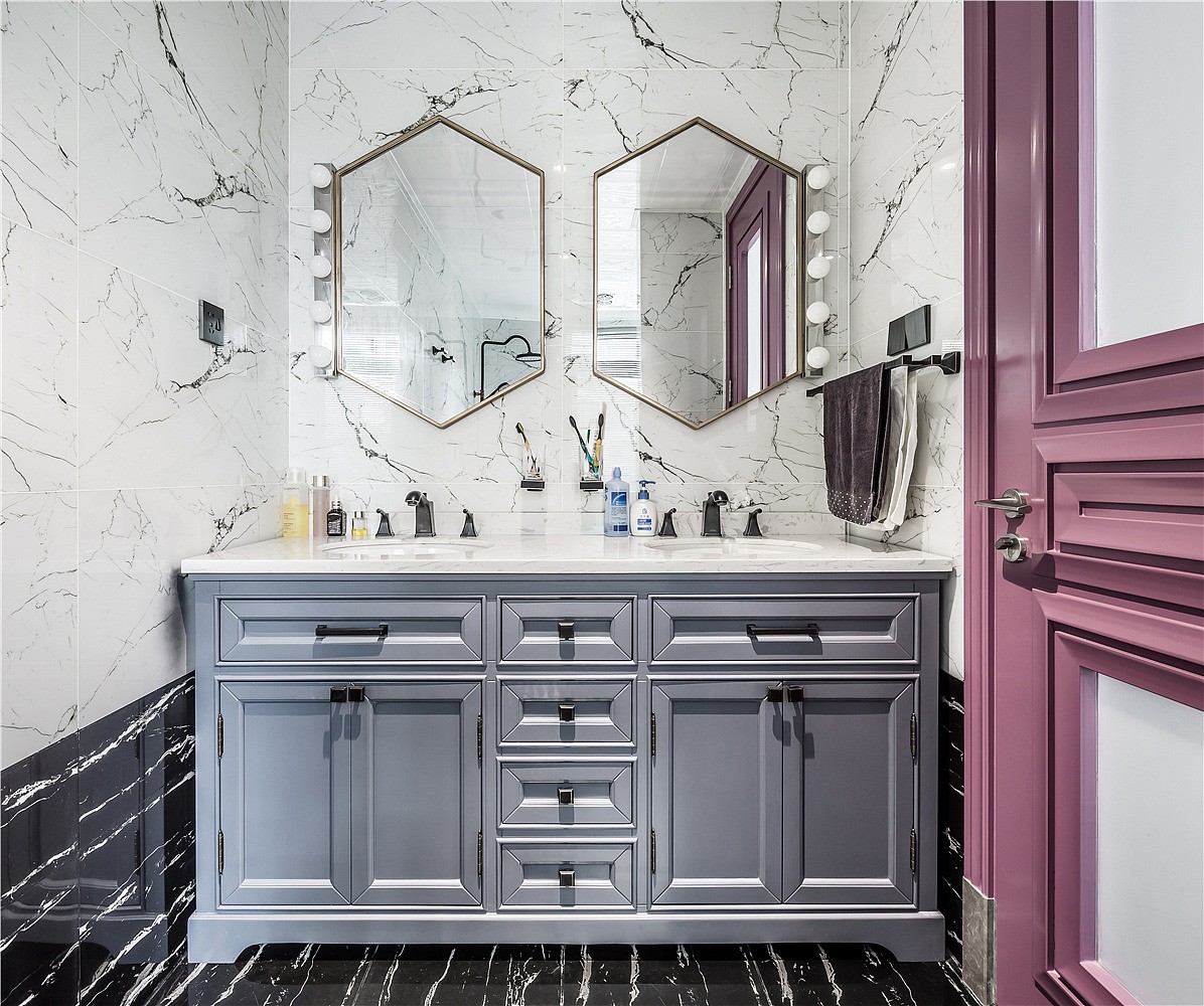 入戶門廳以白色作為基調,紫色門套作為點綴,整體空間驚艷脫俗。地板選用更易清洗、更耐磨損的全瓷磚鋪設,大理石貼墻與地面一起,把客餐廳的整體基調定在了一個雅字上,典雅大氣。深色的皮質沙發把整個客廳的冷色調提了起來,像一杯香醇的咖啡,迅速捂暖了大理石的冷硬。主臥室淺棕色、黑色、紫色、白色,四大色塊干凈利落的劃分出主臥的空間層次,床頭細節的處理使空間更有縱深感。主衛生間銀白龍和爵士白的采用與客廳的整體色調一脈相承,三種切割成不同大小的瓷磚拼接造型,使小小一方天地也能層次分明。