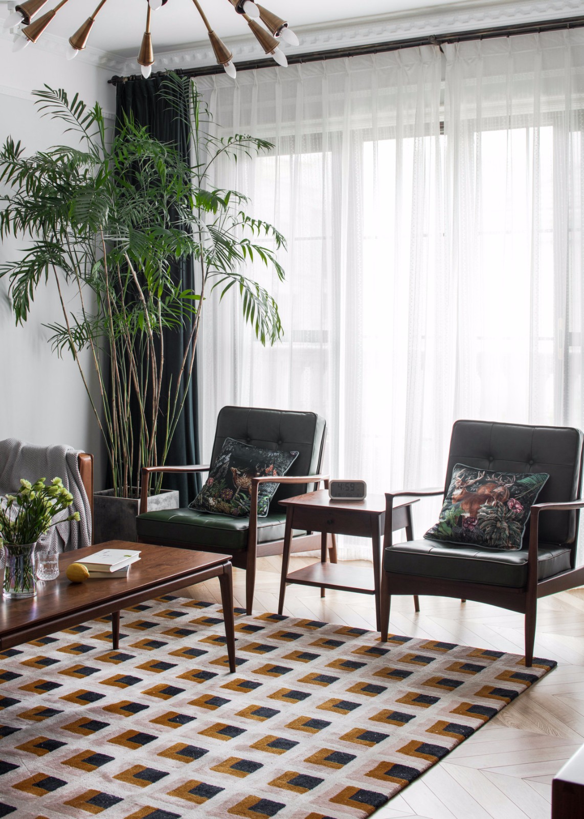 客廳大體是一家三口最長活動場所,這個區域我總體采用的功能性和美觀性結合的方式。 整體色調的統一:整體以胡桃實木的顏色做總色調,從胡桃實木的茶幾到胡桃木的電視柜,再到棕色調的真皮沙發,最后再是一塊長方形的大地毯,做幾個顏色(淺白+棕色+黑色)的重疊,與整個空間所有顏色進行呼應。房主很喜歡夏威椰,因為有竹的氣質,因此它別名也叫夏威夷竹子。濃綠的色彩,茂密的枝條,富有光澤的綠葉傳遞給人一種欣欣向榮的精神氣。它能通過呼吸微調節空氣環境,吸收房中甲醛等揮發性物質。從風水上來講,它放在柱子下面有去煞氣之說。