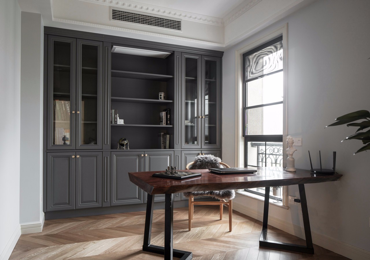 書房空間開放之后,光線充足,空間自由,全實木材質的定制書桌書架,搭配原木色的椅子,十分有質感。 這大概是房東的私人空間,墻面的部分做了櫥柜,方便擱置書籍和小禮物的地方。顏色調性和廚房櫥柜保持了一致。 書桌買了簡易型又文藝的桌子,甚至它可以搖身一變,變成茶室(自行想象)。靠近窗戶的位置,也是為了采光較好,方便閱讀和思考。有時候頭腦需要休息的時候,還可以向著窗外吹吹風,發發呆。