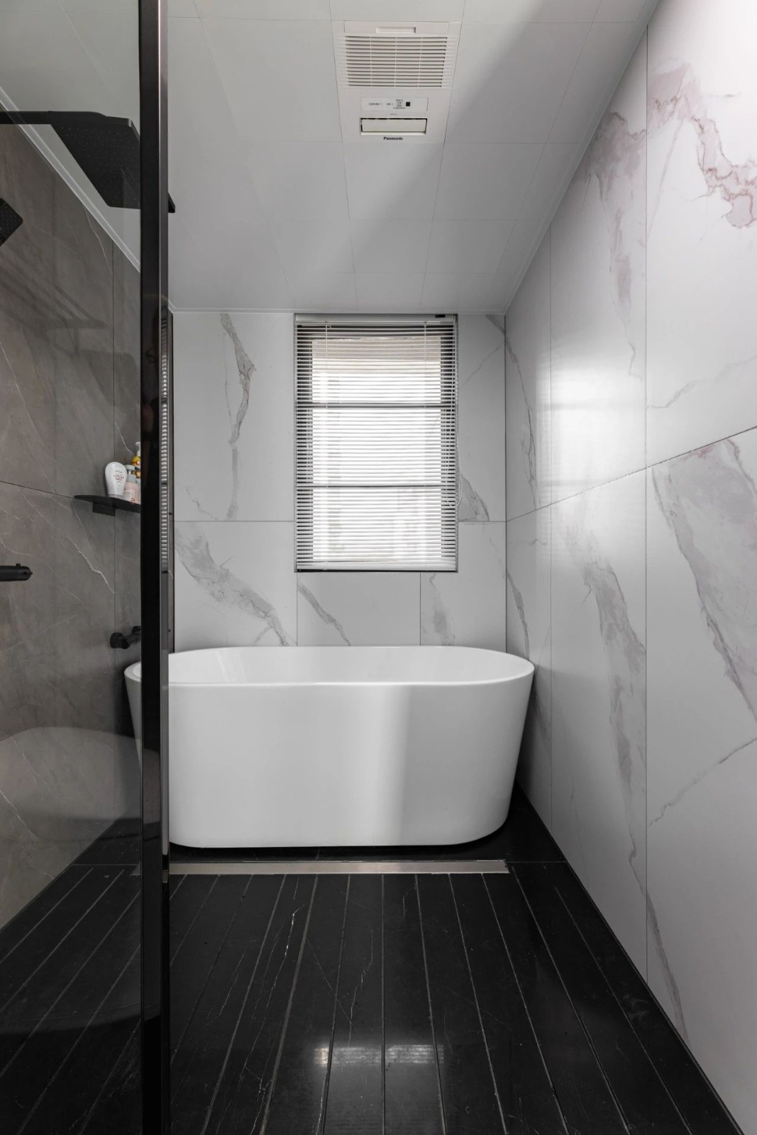 淋浴區地面做成石材拉槽設計,下水快又防滑,墻面的壁龕可放置洗浴用品,節省空間,拿取又方便。