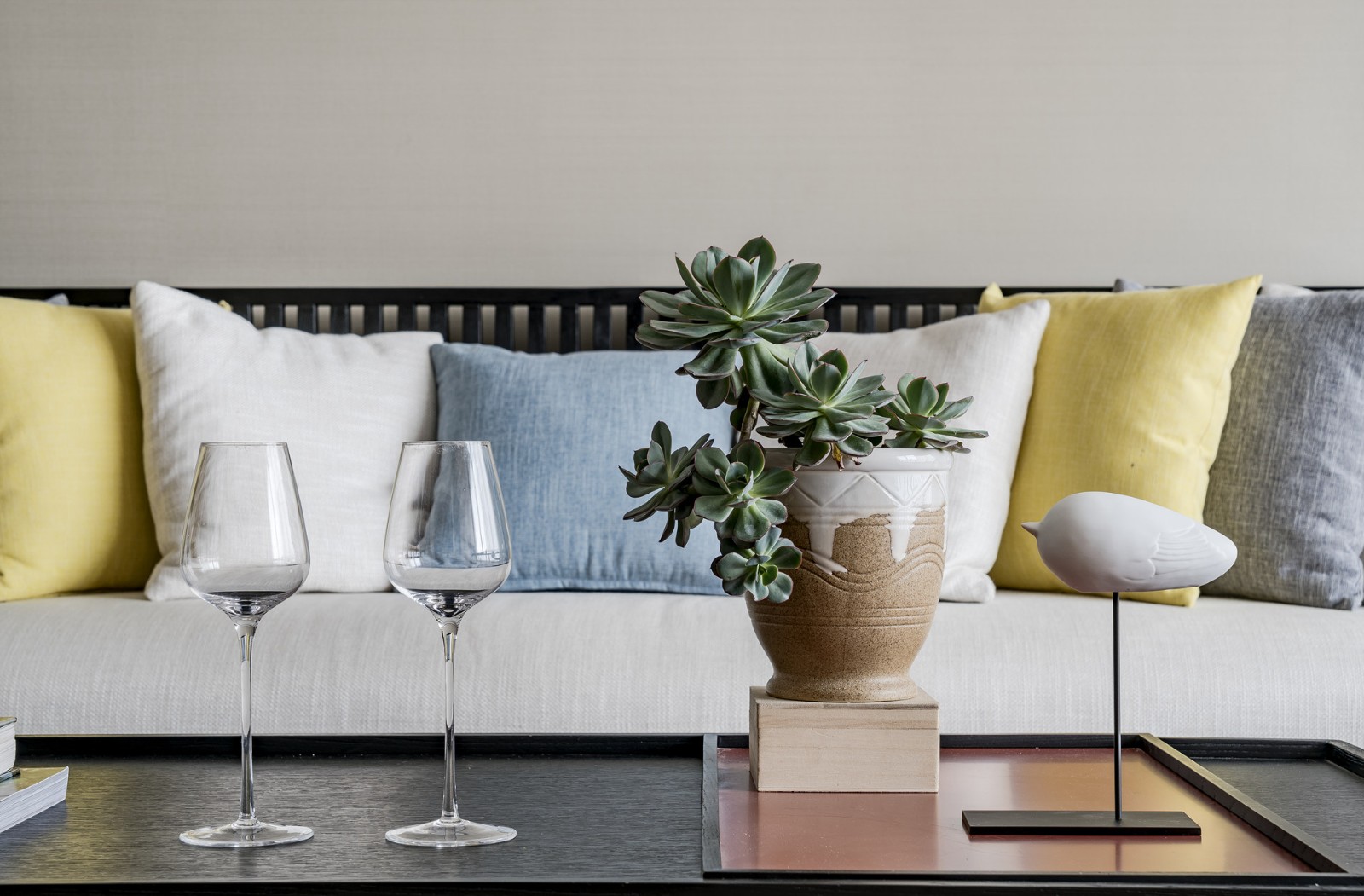 沙發背景墻珍珠白乳膠漆,新中式特有的落地燈,簡單的一副山水掛畫就能體現業主的品味。